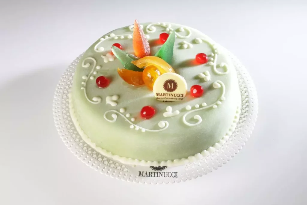 Torta con pan di Spagna bagnato allo Strega, farcita di ricotta di pecora siciliana, canditi e gocce di cioccolato, ricoperta da una deliziosa pasta di mandorle. Bagna leggermente alcolica allo Strega.